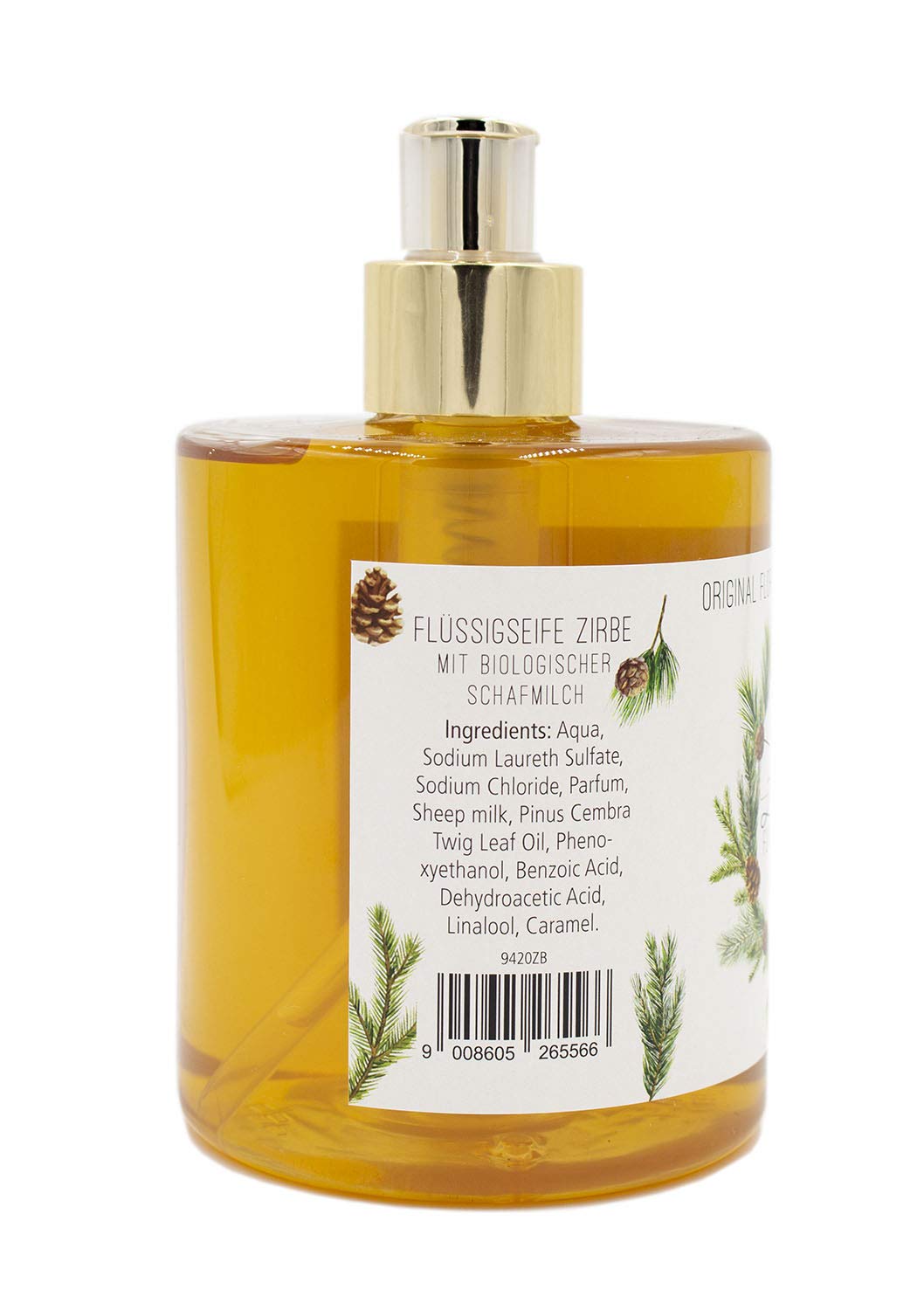 Inhaltsstoff e Flüssigseife Zirbe Ingredients Liquid soap Swiss Pine Ingredients: Aqua, Sodium Laureth Sulfate, Sodium Chloride, Parfum, Sheep Milk, Pinus Cembra Twig Leaf Oil, Phenoxyethanol, Benzoic Acid, Dehydroacetic c Acid, Linalool, Maltodextrin, Caramel.