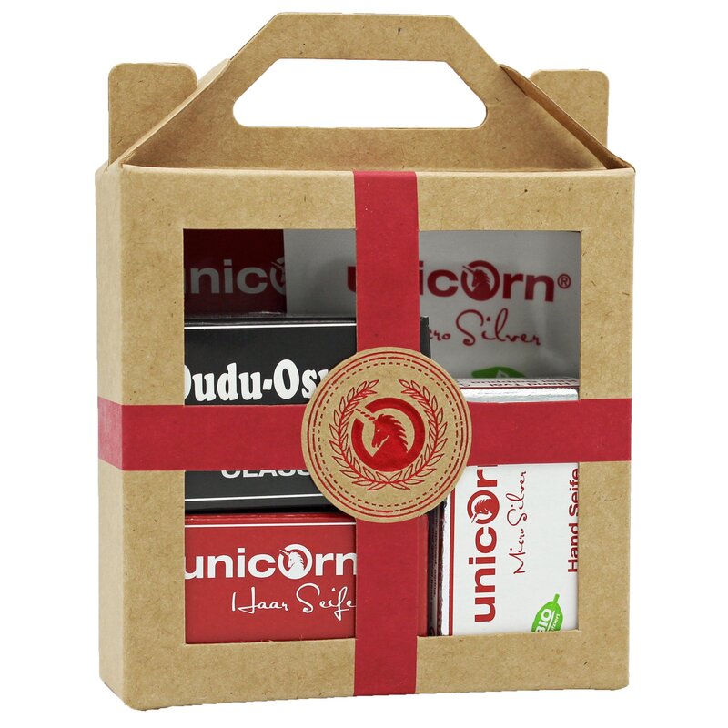 Produktinformationen "Geschenk-Set mini-Apfel Haarseife 16g, sauer Spülung 10ml, Silber Handseife 16g, Silber Handcreme 5ml, Dudu Osun® CLASSIC 25g"