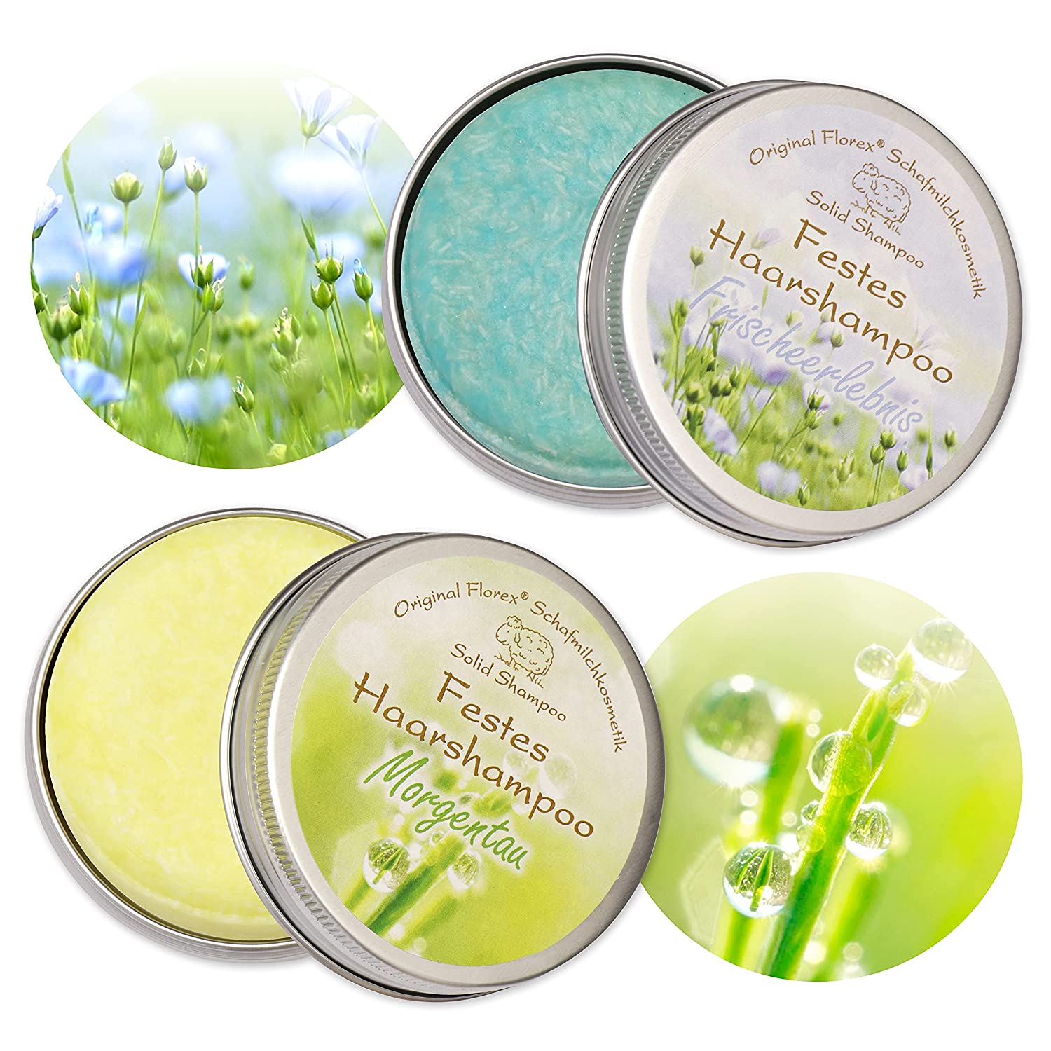Festes Haarshampoo 2x58g, Morgentau und Frischeerlebnis mit Schafmilch verpackt in einer Dose 9239FE-D-MT-D