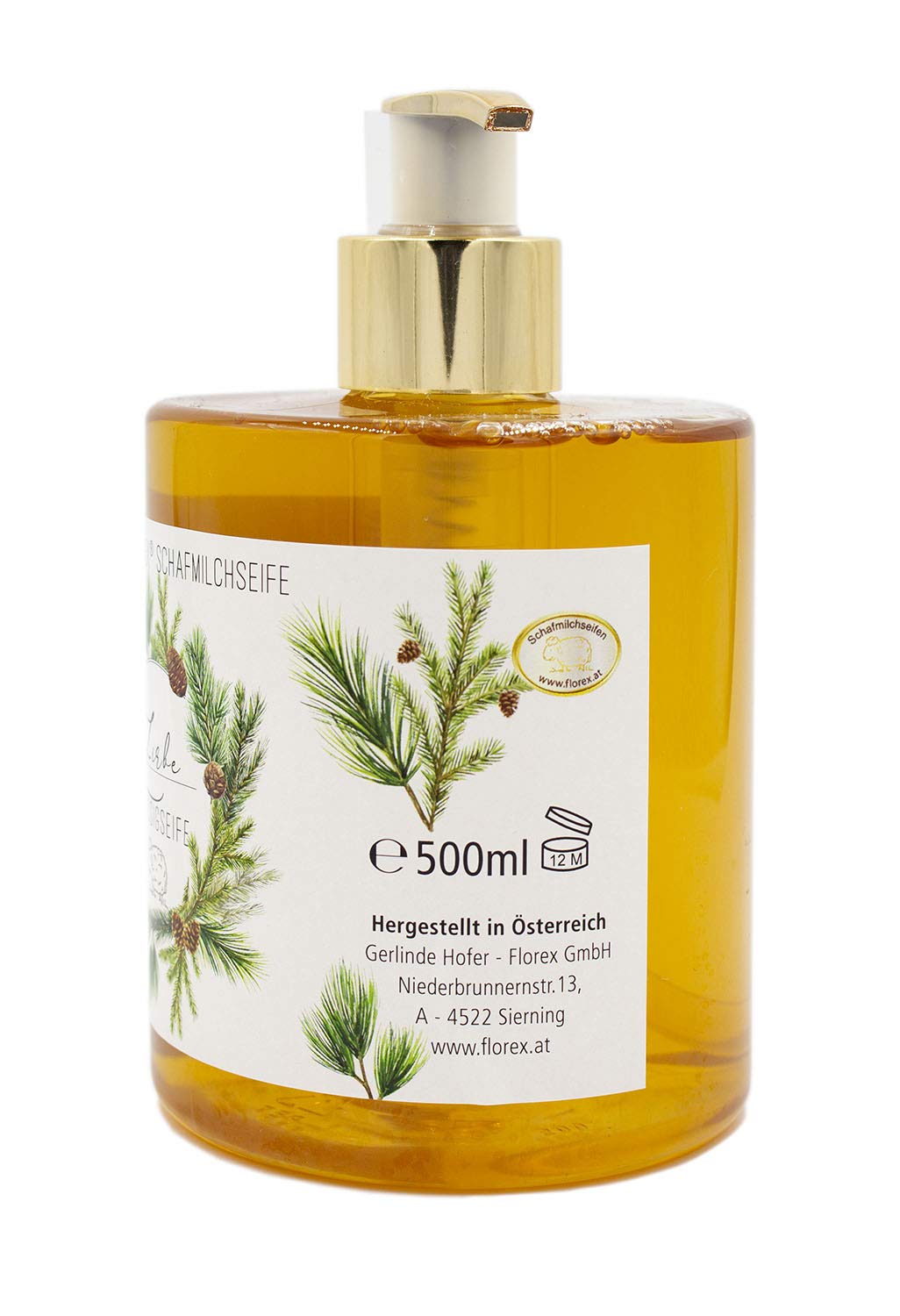 Flüssigseife mit biologischer Schafmilch 500ml im Spender 'Einzigartige Augenblicke', Zirbe 9420ZB