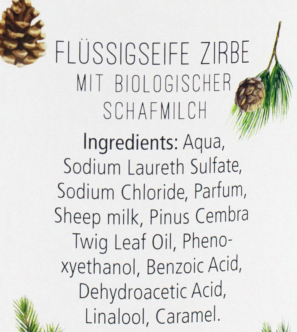 Inhaltsstoff e Flüssigseife Zirbe Ingredients Liquid soap Swiss Pine Ingredients: Aqua, Sodium Laureth Sulfate, Sodium Chloride, Parfum, Sheep Milk, Pinus Cembra Twig Leaf Oil, Phenoxyethanol, Benzoic Acid, Dehydroacetic c Acid, Linalool, Maltodextrin, Caramel.